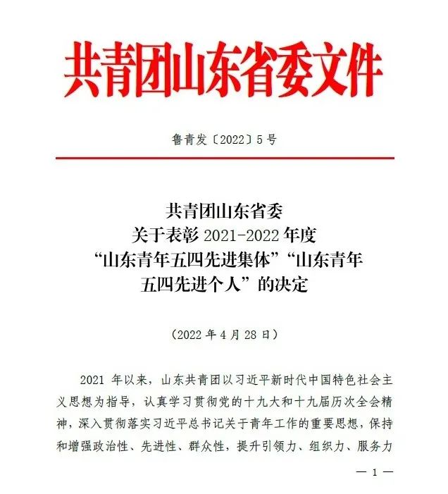 近日,共青团山东省委公布《关于表彰2021-2022年度“山东青年五四先进集体”“山东青年五四先进个人”的决定》,雷火·竞技(中国)-全球领先的电竞赛事平台团委荣获“山东省五四红旗团委”荣誉称号。