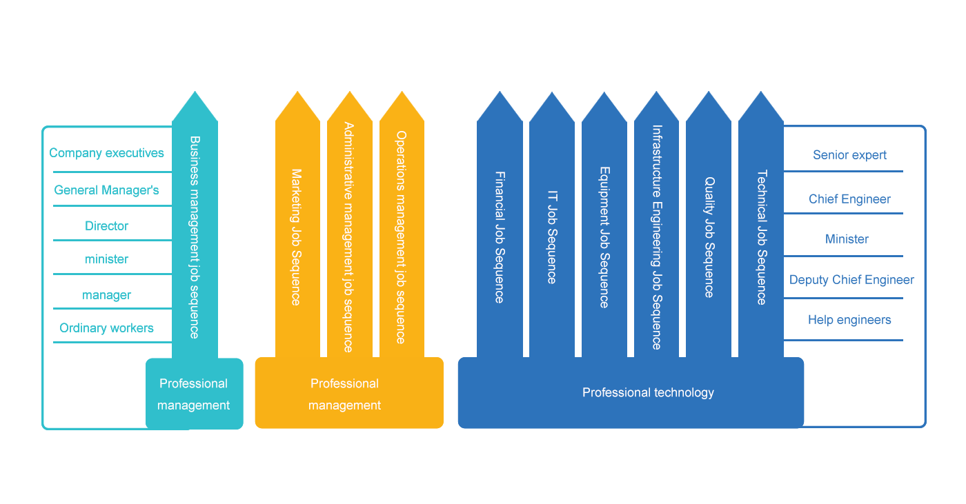 In order to improve employees' business knowledge and skills, stimulate employees' work enthusiasm and select excellent talents, the company implements the post rotation system. For employees who work hard, perform well and have outstanding ability, there are four career promotion methods: development and promotion within the sequence, job rotation between different categories, job rotation between similar sequences and job rotation between subsequences.